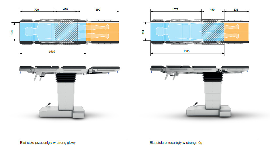 - Przechyły blatu: boczne oraz wzdłużne (Trendelenburg oraz anty-Trendelenburg).